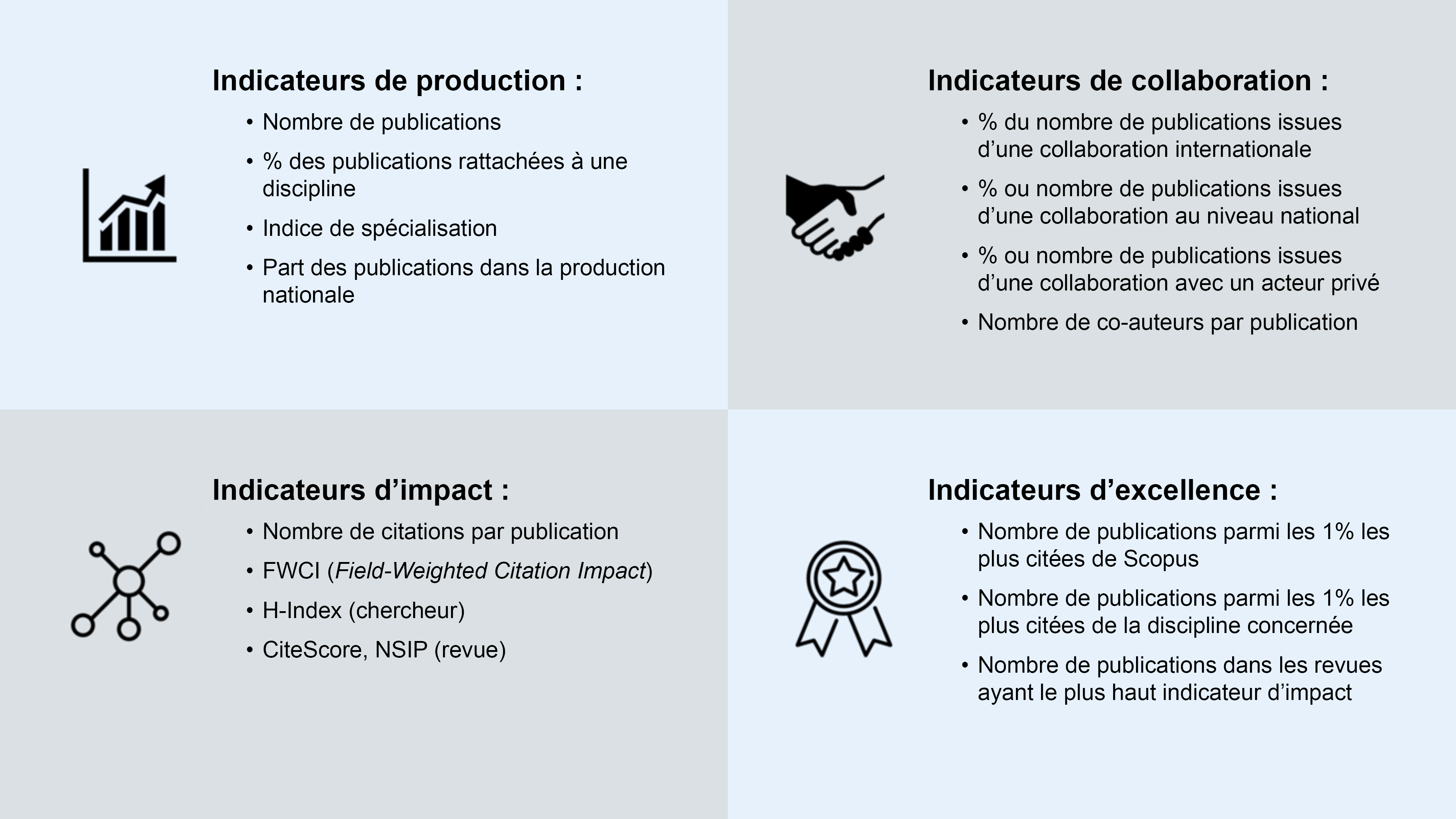 La bibliométrie permet de produire plusieurs indicateurs répartis en grande famille.